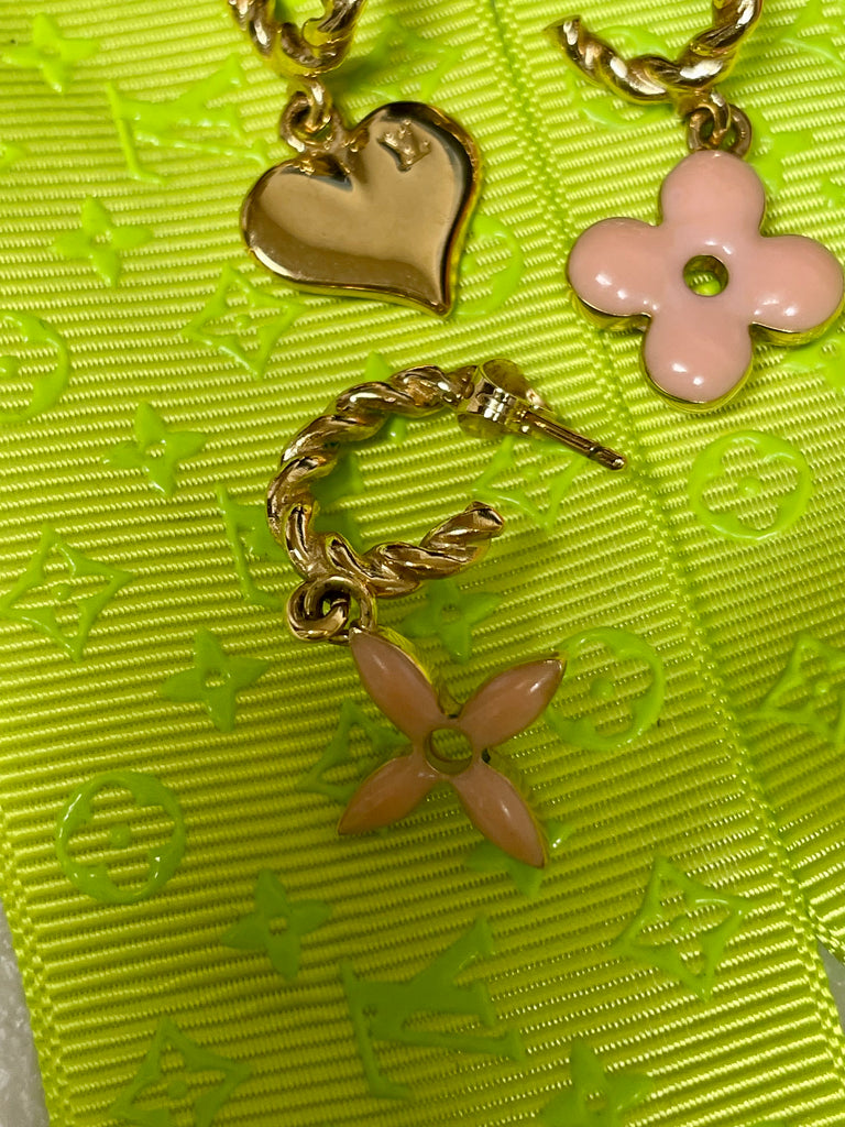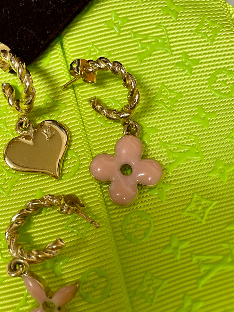 These earrings showcase the Louis Vuitton’s Sweet Monogram Charms. These Sweet Charm Earrings collection interprets LV’s emblematic icons in a feminine and playful way. This is a set of three earrings set in gold tone metal with pink and braided loops that have a heart and two LV monogram Freire dangling. Switch out these cute earrings for a fun and playful look. The earrings are clean and beautiful. Dustbag included.